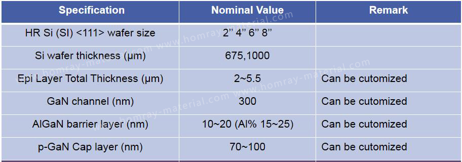 Homray Material Technology provides high-performance and high-quality GaN HEMT epitaxial wafers, including GaN-on-Si Epi wafer with Power HEMT E-mode and D-mode. We supply 2 inch,4inch,6inch,8inch GaN-on-Si Epitaxial Wafer with favourable price on the market in China. Silicon thickness is 675um and 1000um. Customized structure and layer parameters are available jin HMT company.