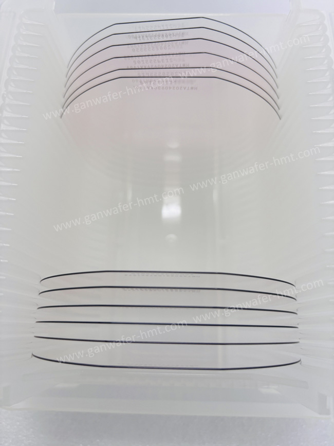 HMT公司生长供应4英寸碳化硅基氮化镓外延片,GaN-on-SiC结合了碳化硅优异的导热性和GaN高功率密度、低损耗能力,衬底上的器件可在高电压和高漏极电流下运行,结温将随RF功率缓慢升高,RF性能更好,目前多数GaN射频器件的衬底都是碳化硅。受限于SiC衬底,目前我司供应主流尺寸为4英寸与6英寸,GaN-on-SiC外延片主要用于制造微波射频器件。