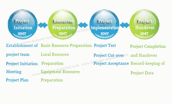 Technology service system includes fault handling, engineering implementation, project management, on-site support, complaint handling and customer visit etc. Homray Material Technology Project Implementation Process/Service System Flowchart.